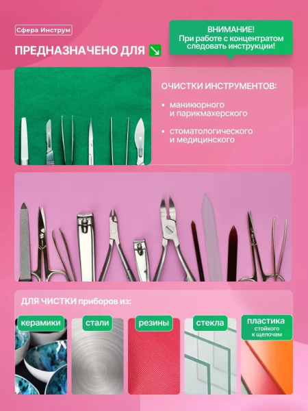 Средство предназначено для очистки маникюрного и парикмахерского инструмента после неправильной обработки от моющих и дезинфицирующих растворов. Средство очищает инструмент от коричневого налета, который образуется в результате неправильной обработки (дезинфекция и стерилизация).