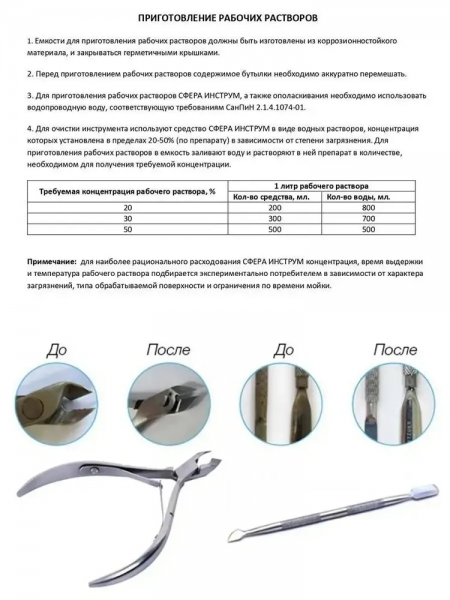 Рабочий раствор готовят путем разведения концентрата в воде, в соотношении 1:1, 1:2, 1:3, где первое значение концентрат, а второе вода.